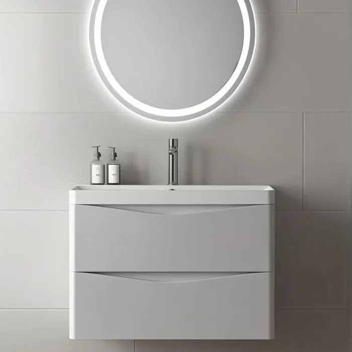 تنسيق النمط العام: مزوّد بمرآة دائرية تنبعث منها إضاءة دائرية، ويعزز شريط الضوء الحلقي الشعور الرائع بالمساحة، بالإضافة إلى خزانة PVC ذات اللون الرمادي وسطح العمل البسيط. من الخصائص المادية إلى التصميم الوظيفي، فهي تبني بشكل شامل مشهدًا عمليًا وجميلًا للحمام، وتلبي الاحتياجات المتنوعة للعائلات العصرية لتخزين الحمام والمتانة والمظهر.