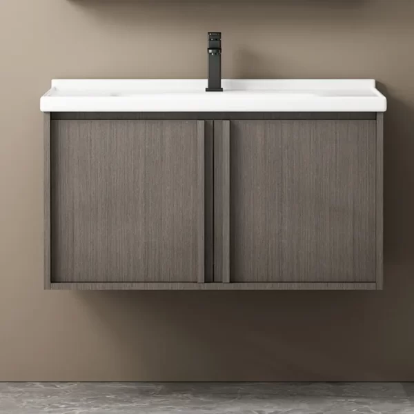 خزانة حمام بالجملة. مادة SPC صديقة للبيئة، لون بني فريد من نوعه، مع حوض سيراميك وصنبور أسود، مثالية لحمام الفندق الحديث. توريد المصنع مباشرة، دعم خدمة OEM، اتصل بنا للحصول على حل مخصص وعرض أسعار.