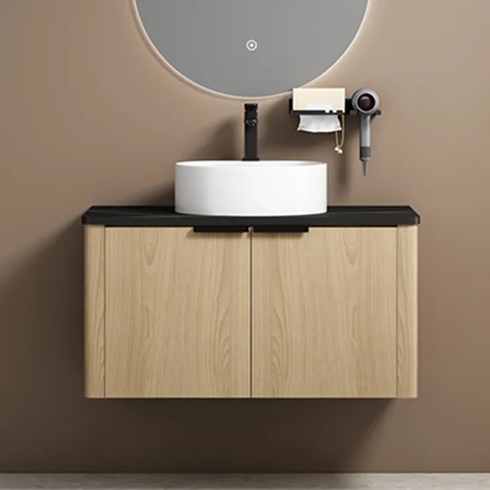 Wholesale bathroom sinks vanity with wall-mounted PVC cabinet, durable black sintered stone countertop, LED smart mirror, and efficient storage. Multiple colors are available for selection. Factory direct for hotels, apartments, and bulk residential projects. Contact us today for quotes and catalog details.