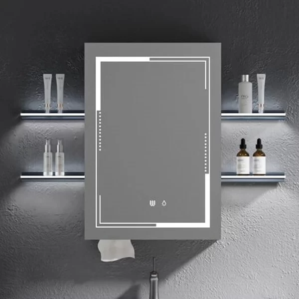 مرآة الإضاءة الذكية: خزانة المرآة مزودة بشرائط إضاءة LED حولها، والضوء ناعم وغير مبهر. المفتاح الذي يعمل باللمس بسيط ومتين ومناسب لاحتياجات العناية اليومية.