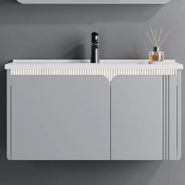 Modernes Erscheinungsbild: Der hellgraue Schrank wird mit einem weißen Keramikbecken kombiniert, das vielseitig und modisch ist und zu verschiedenen Einrichtungsstilen im Bad passt.