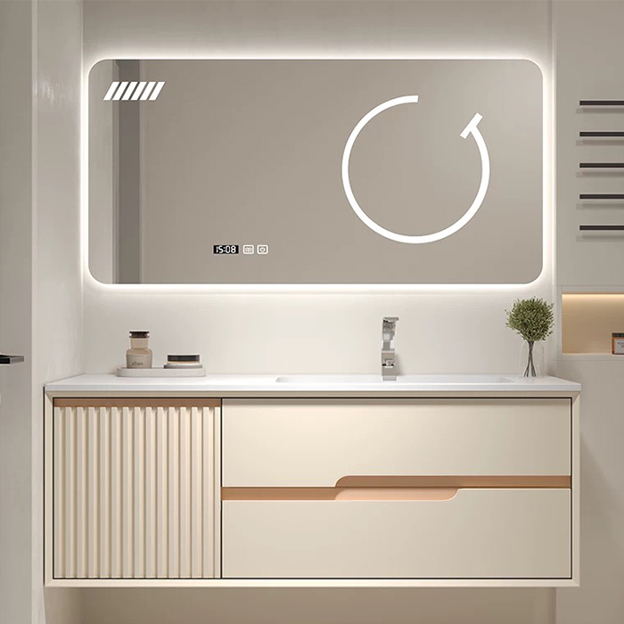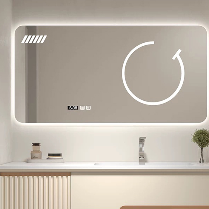 Smart Mirror Cabinet: LED mirror with surround ambient lighting, dual-touch LED, anti-fog function, and time display—high-quality and fully functional.