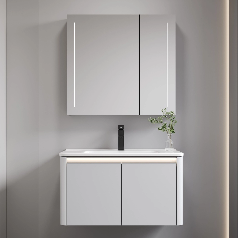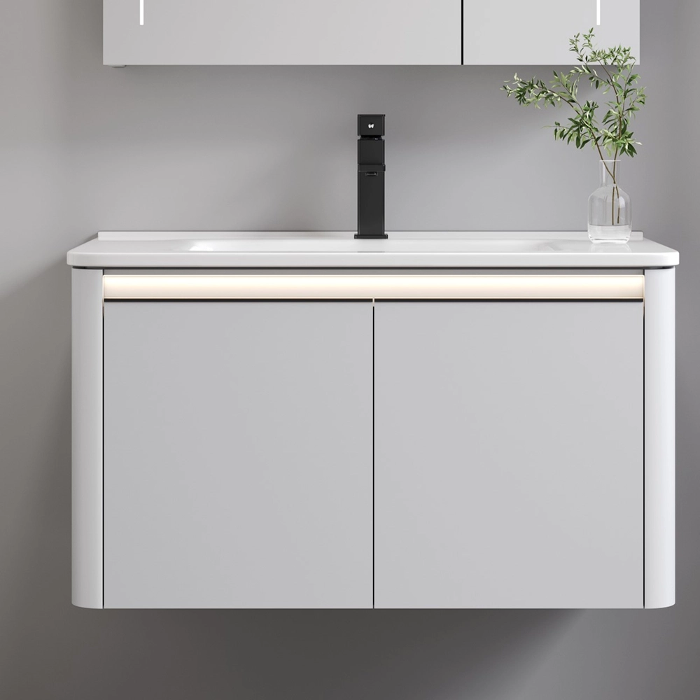 Armarios de baño elegantes y de alta calidad hechos a medida con lavabos de cerámica y espejo LED, esquinas redondeadas, adecuados para cualquier espacio de baño. Stock a granel semipersonalizado, servicio OEM/ODM, gama completa de accesorios de baño. Póngase en contacto con nosotros para obtener soluciones al por mayor.