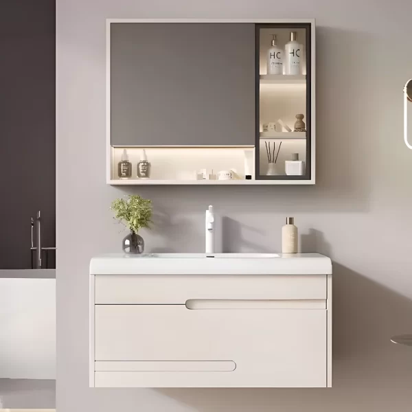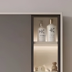 Exquisito armario con espejo de diseñoEl armario con espejo de arriba tiene un espacio cerrado en un lado, que proporciona un lugar de almacenamiento oculto para artículos privados o de uso poco frecuente, libre de intrusiones de polvo; En el otro lado, hay un estante abierto donde los artículos de tocador de uso común, fragancias y otros artículos se pueden colocar libremente para un fácil acceso.