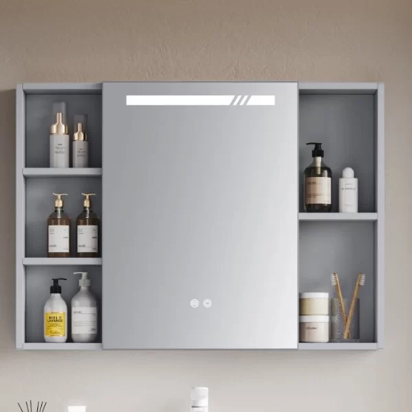 Armario con espejo LED inteligente: El armario con espejo está equipado con una tira de luz LED sensible al tacto, la iluminación es natural y suave, satisfaciendo las necesidades de lavado diario, maquillaje y otros usos, creando una sensación de tecnología.