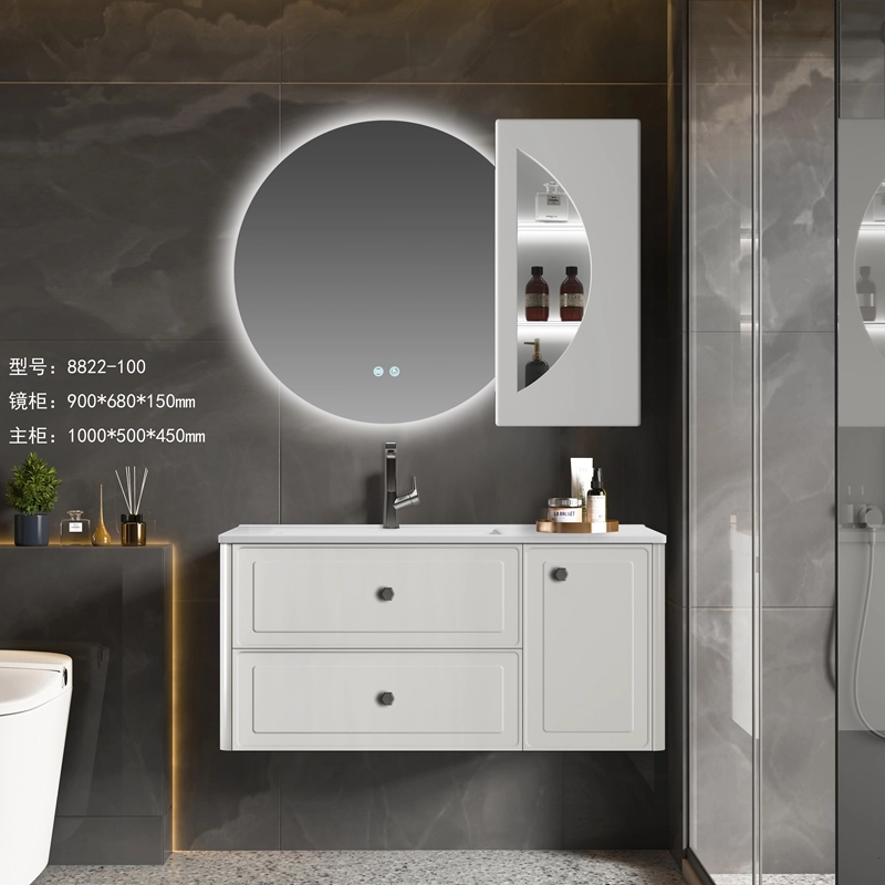 Quelques combinaisons de taille: Les dimensions de l'armoire de toilette sont de 900×680×150 mm et celles de l'armoire principale de 1000×500×450 mm. Elle convient à la plupart des types d'aménagement de salle de bains et répond à la double exigence de rangement et d'esthétique des différentes salles de bains.