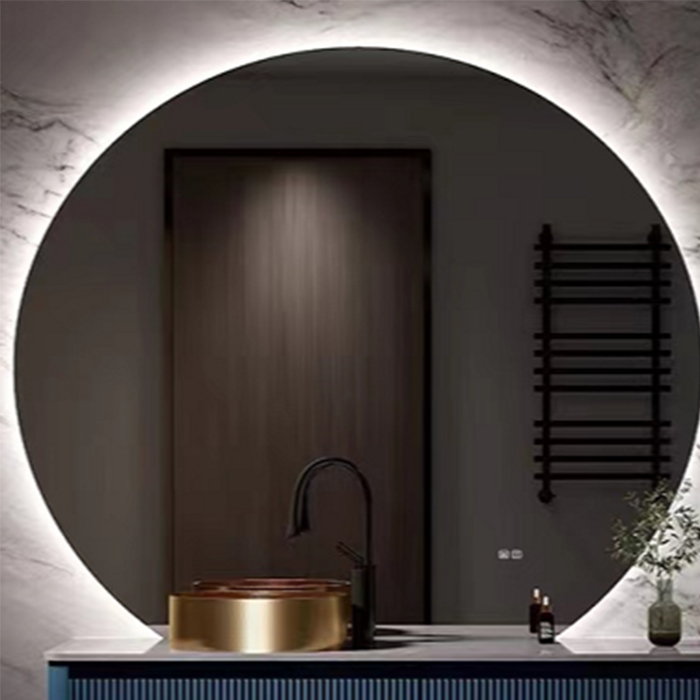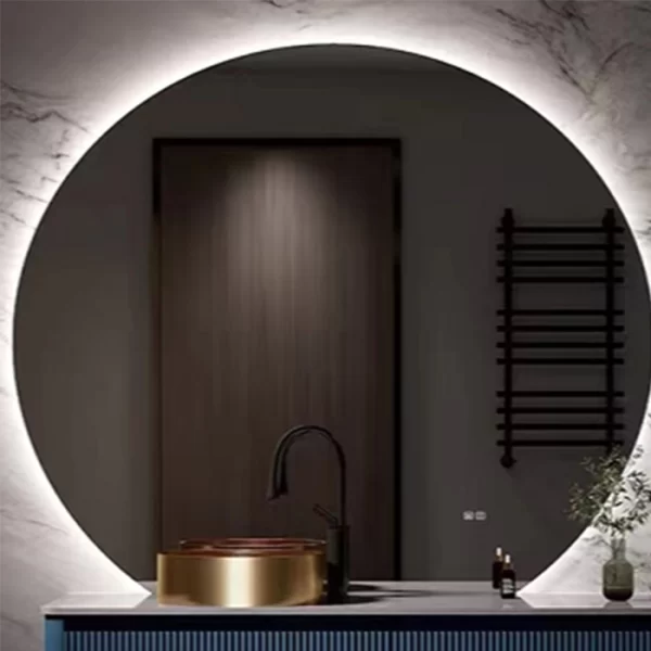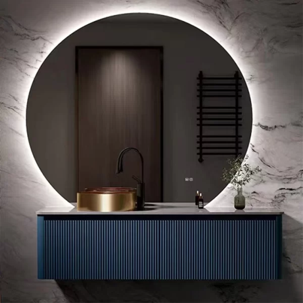 モダンな外観:100cm仕様は、コンパクトで調和のとれたレイアウトで、ほとんどのバスルームスペースに適しています。プライウッドキャビネットはさまざまな表面加工が可能で、素朴な風合いやファッショナブルな風合いを表現できます。御影石のナチュラルな質感と相まって、シンプルでモダンな雰囲気を醸し出しています。円形のバックライト付きミラーが、洗練された高級感を演出し、バスルームの印象を高めています。