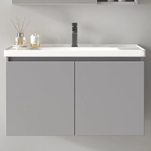 Wholesale bathroom vanities custom cabinetry with ceramic basin and LED mirror cabinet, gray minimalist style, wall-mounted design, ideal for modern bathrooms. Factory direct supply, bulk semi-custom stock. Contact us to get custom solutions and wholesale quotes.