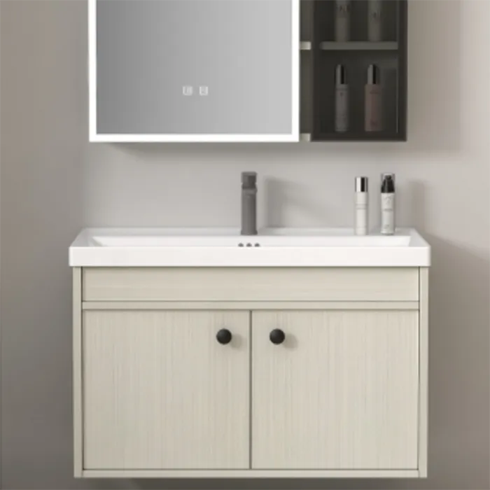 Bathroom vanity with mirror custom features a wall-mounted structure, high-density waterproof SPC material, an LED mirror cabinet, and a ceramic basin. Moisture-proof, corrosion-resistant, customizable for hotel, commercial and residential bathroom projects. Factory direct with stable bulk supply. Inquires now!