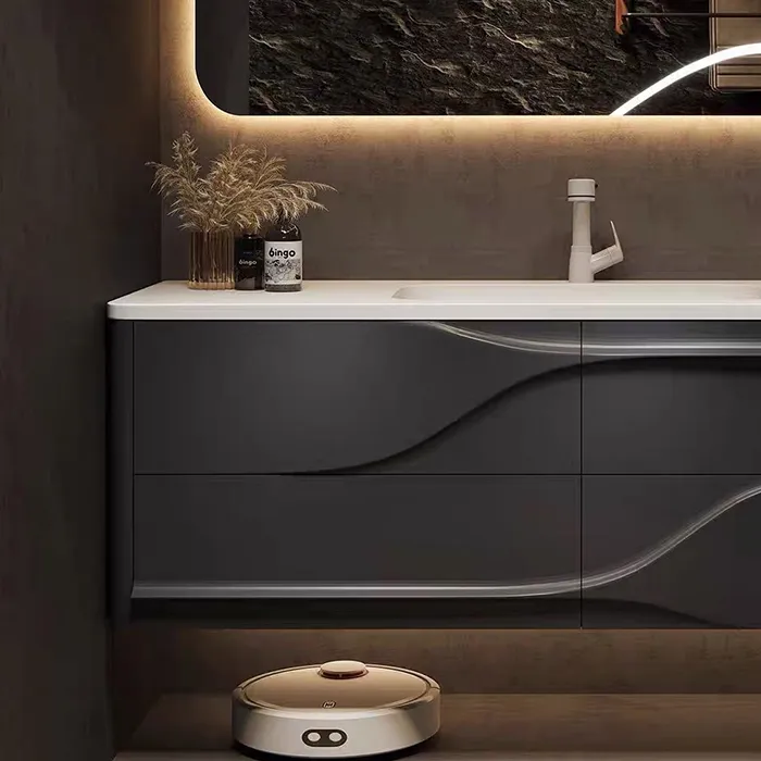 Novel design: The Italian-style light luxury PVC bathroom cabinet features a dark gray color scheme with streamlined textures, combined with the light and shadow design of LED smart mirrors, perfectly integrating fashion and practicality, becoming the aesthetic and functional responsibility of the bathroom space.