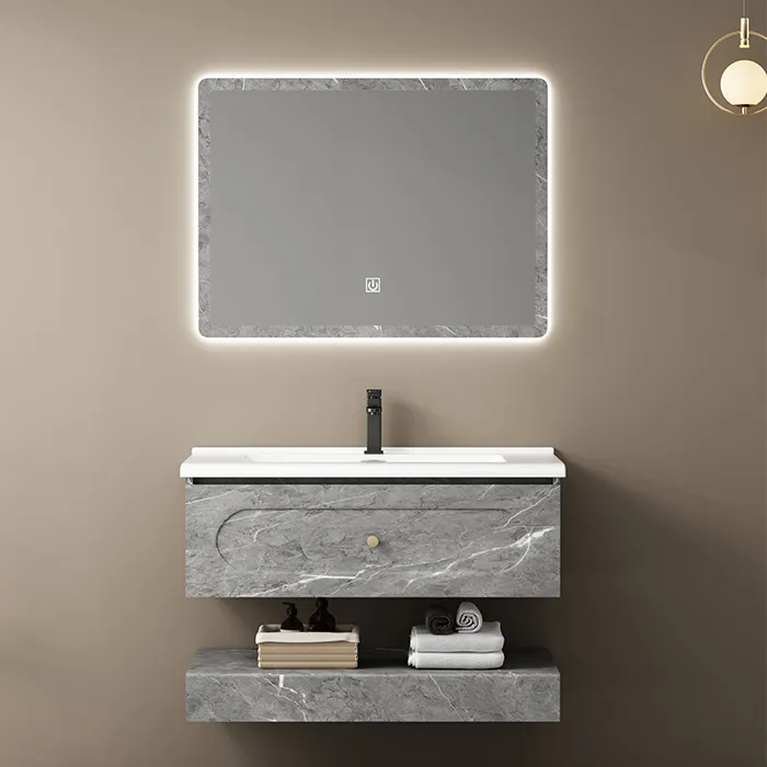 Custom gray bathroom cabinets, aluminum material, wood-grain texture, suspended design, with a standard size of 80cm. The intelligent mirror surface is clear and bright. The ceramic basin is smooth and durable. With high cost-effectiveness, it helps create a comfortable and convenient bathroom environment. Welcome to inquire!
