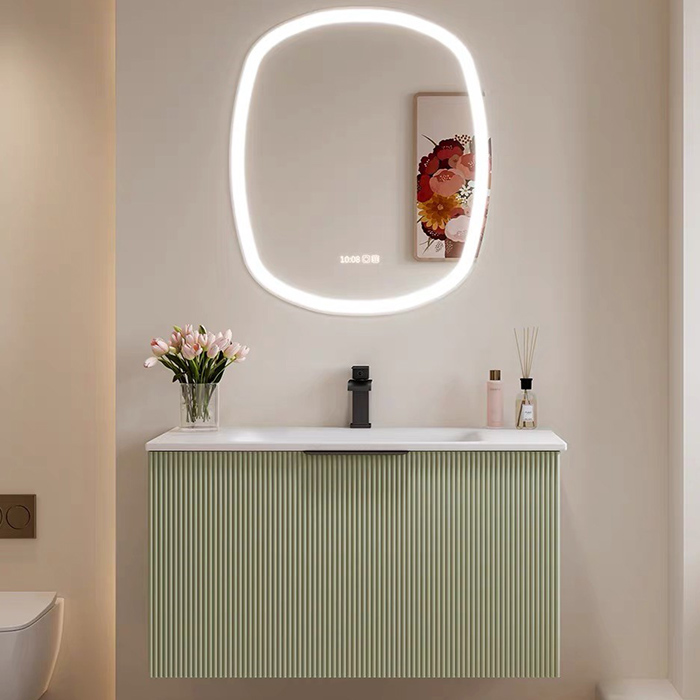 Custom green bathroom cabinets, 80CM PVC bathroom vanity with a mounted structure, which is specially designed for small bathrooms. The vertically patterned cabinet doors add an artistic touch, and the basic mirror meets daily needs. Shouya factory direct supplies with bulk order discounts. Welcome to inquire!