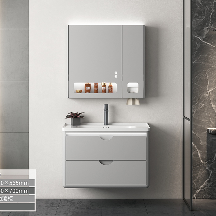 Custom grey bathroom vanity cabinet, waterproof PVC material, featuring a double-drawer floating base, an LED mirror cabinet, and an integrated ceramic sink, perfectly suited to a modern bathroom. Factory direct supply, offering bulk pricing and customization services. For more information or a quote, please feel free to contact us!