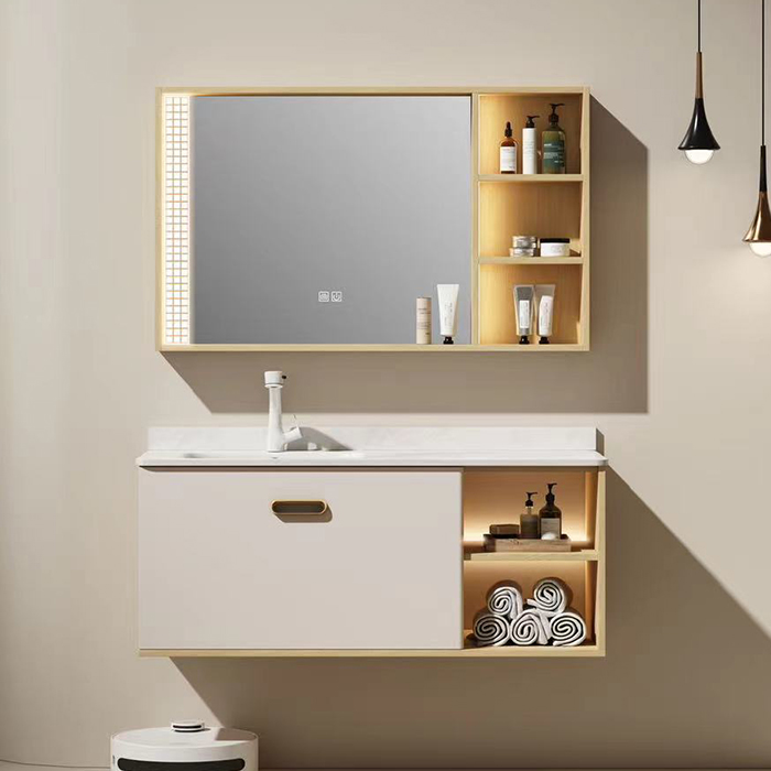 Efficient space utilization: The left side of the main cabinet features a drawer design, which allows for smooth sliding and is suitable for storing small items such as jewelry and cotton swabs. Items are categorized to avoid clutter and facilitate easy retrieval. The right side is designed with shelves, providing ample space for larger bottles, cans, or spare towels. This design makes items easy to view and access, enhancing space utilization.