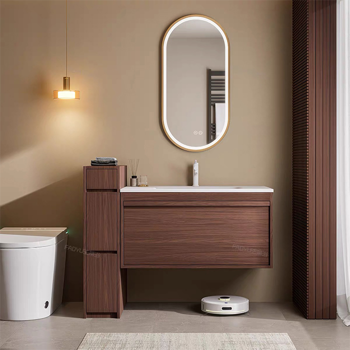 Thoughtful storage design: It adopts the combination of “main cabinet large drawer + side high cabinet”. The main cabinet’s large drawer can accommodate large items such as toiletries and bath towels, while the side high cabinet can store small items such as cosmetics and toothbrush cups in layers. The classified storage keeps the bathroom tidy and meets the daily storage needs of the whole family.