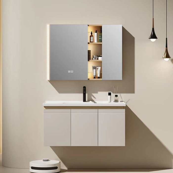 Wholesale floating bathroom cabinets, featuring LED bathroom mirror cabinets. These minimalist, handleless designs are elegant Khaki vanities. Factory direct from Shouya, support customization options with competitive pricing and reliable delivery. Contact us for a quote and proposal.