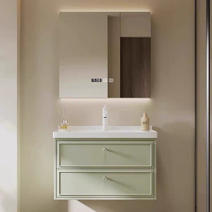 Wholesale green bathroom cabinets, crafted from durable plywood for a lightweight design. Featuring a suspended design and a mirror cabinet with a matching color scheme, they also integrate a built-in smart clock and LED light strip. The cost-effective bathroom solution is perfect for modern, small-sized bathroom upgrades. Contact us for a custom solution.