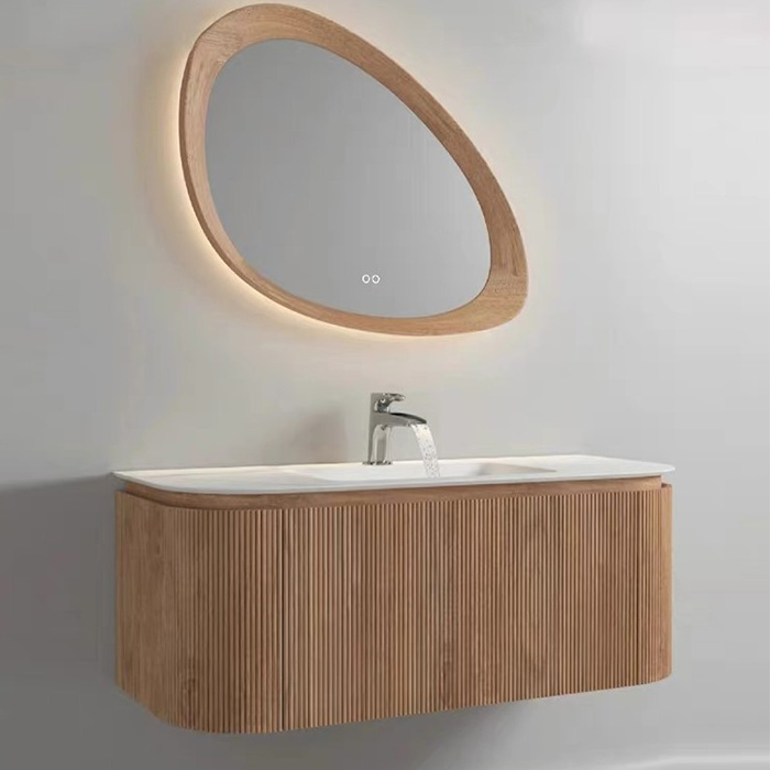 Welcome wholesale bathroom mirror cabinet, it features an irregular mirror, vertical stripes a double drawer design, creating a stylish and space-saving design. Made of plywood material, it’s durable and offers ample storage space. Factory direct supply, we support wholesale and customization, making it ideal for projects and distributorships. Contact us now to get a quote!
