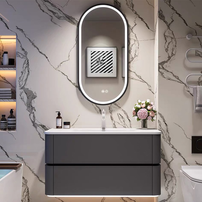 Wholesale grey bathroom cabinets,80CM bathroom cabinet, integrated smart LED mirror, providing clear lighting and a warm atmosphere. Made of eco-friendly PVC material, it is waterproof, moisture-proof and easy to clean. Simple yet stylish. This bathroom cabinet perfectly combines technology and aesthetics. Welcome to inquire immediately.