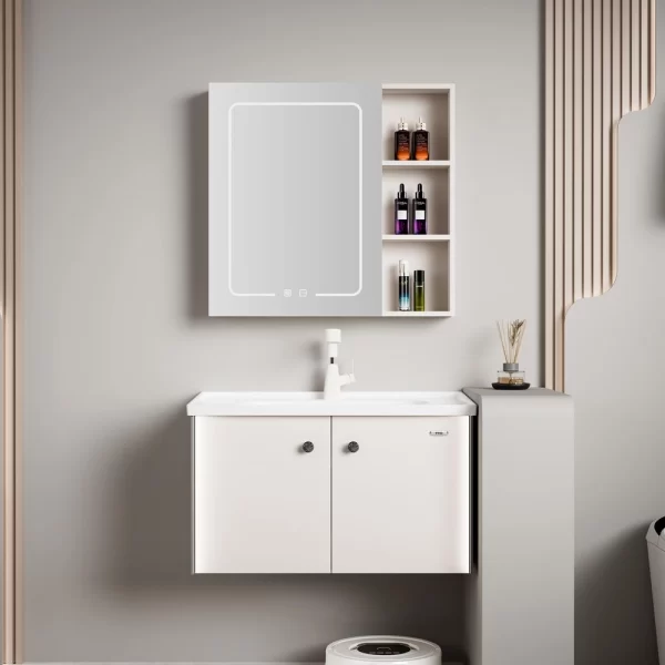 Добро пожаловать на оптовую продажу тщеславия для ванной комнаты из нержавеющей стали, элегантного белого цвета, с металлическим покрытием против отпечатков пальцев, демонстрирующим современный промышленный стиль. Смеситель и зеркальный шкаф принимают тот же дизайн, обеспечивая универсальный оптовый сервис шкафа для ванной комнаты. Завод прямых продаж, добро пожаловать на запрос в любое время!