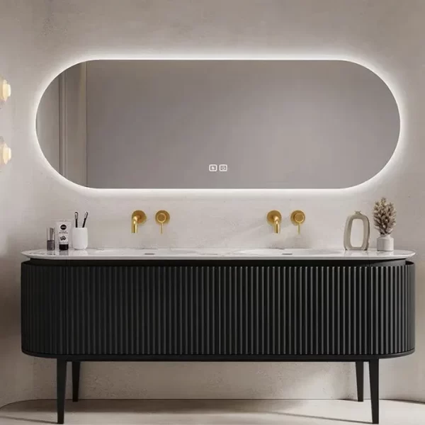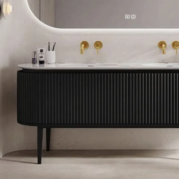 Двойная конструкция раковины: позволяет нескольким людям мыться утром без конфликтов, поддерживая гигиену в отдельных зонах, повышая эффективность использования. Четыре напольные ножки приподнимают шкаф, защищая его от влаги, снижая риск повреждения влагой.