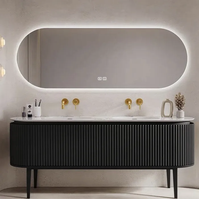 Большая емкость для хранения: Дизайн системы хранения отвечает повседневным потребностям. Изогнутое внутреннее пространство дверцы шкафа используется для хранения крупных предметов, таких как банные полотенца, а выдвижные ящики - для хранения мелких вещей. Сочетание открытости и закрытости позволяет разместить общие предметы по своему усмотрению, а личные - спрятать, избавив ванную комнату от беспорядка и обеспечив порядок и чистоту.